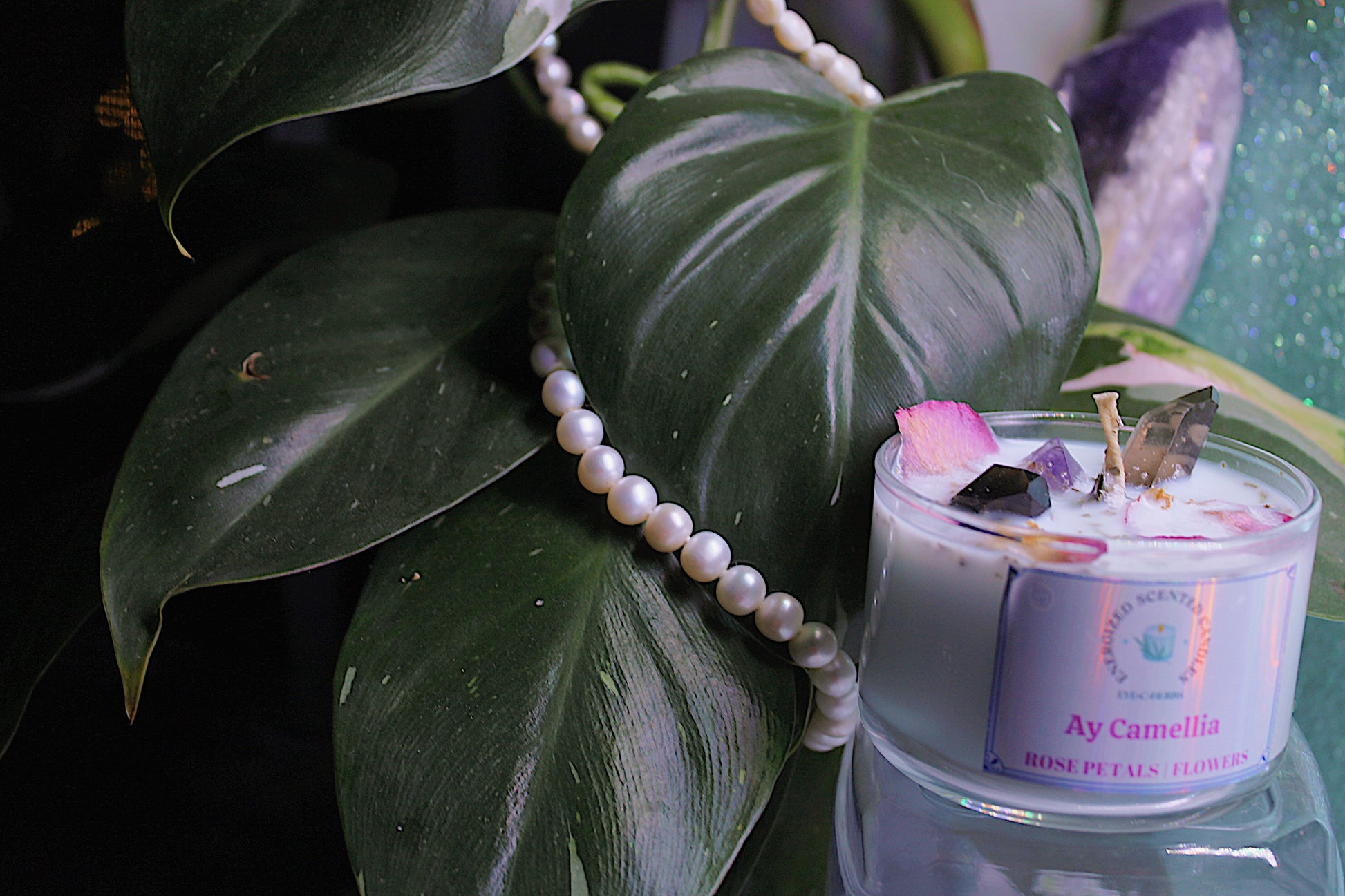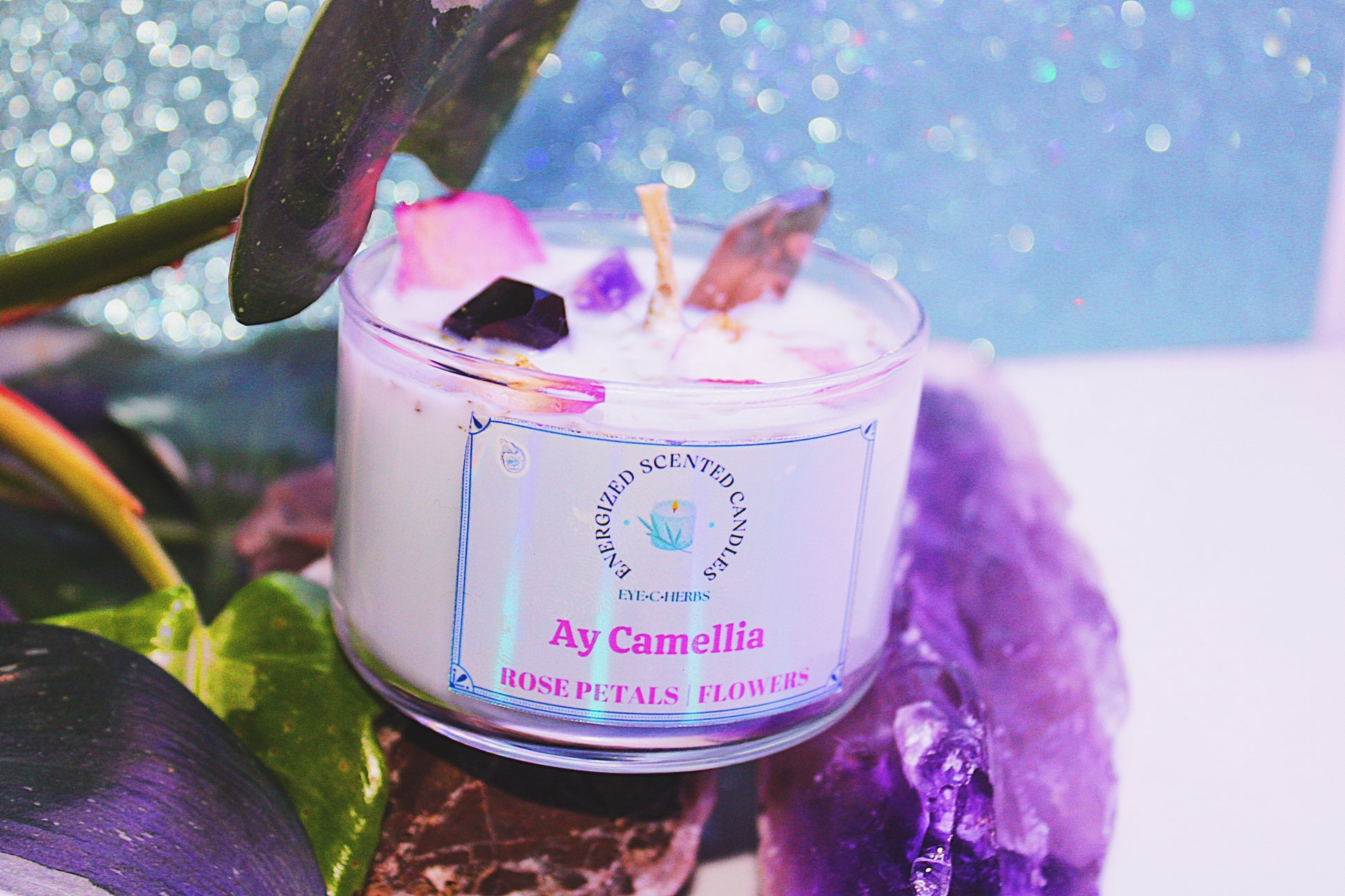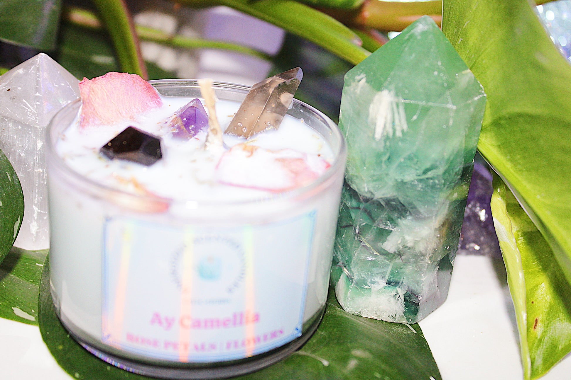 Ay, Camellia candle is a 100% handmade candle, created especially for healing, and loving thyself. It is intended for great abundance and motivation, and adoration. Attracts positivity, good luck, and love! Light it up with any manifestation and believe it shall it come. Crystals charge with the full moon & with Mother Nature's great energy.