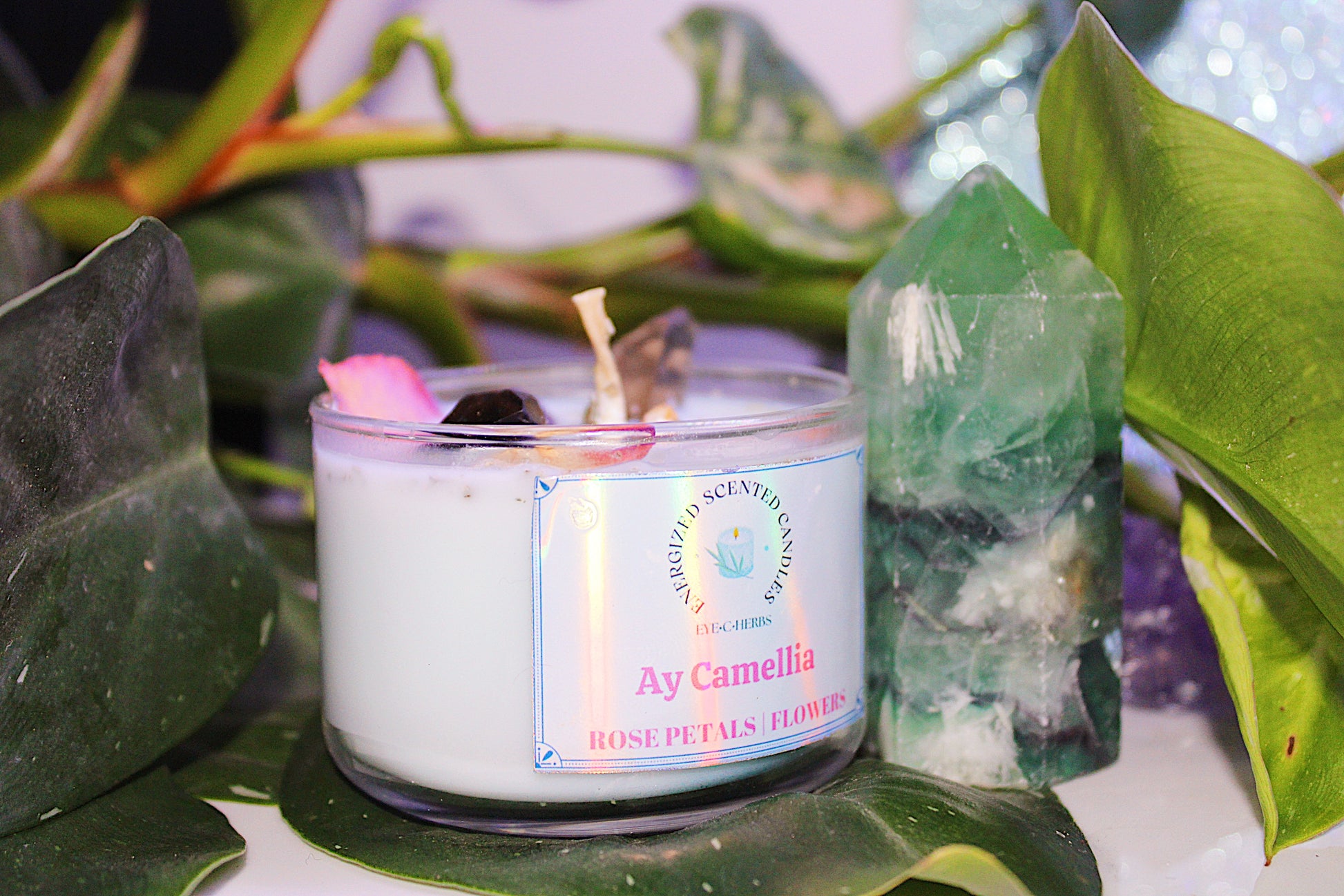 Ay Camellia is a 4.5 oz energized scented candle topped off with crystals and herbs. Crystals grown with so much strength and power as human beings, herbs grown with so much love and so much care as only some human beings but what makes it all special it’s their light and power and every human being.